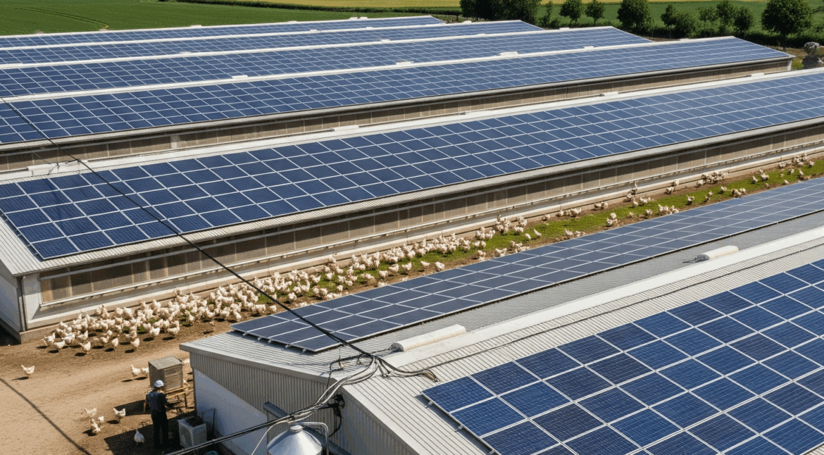 Solar energy in poultry farming helps power ventilation, heating, and automation systems — reducing electricity bills and supporting clean energy.